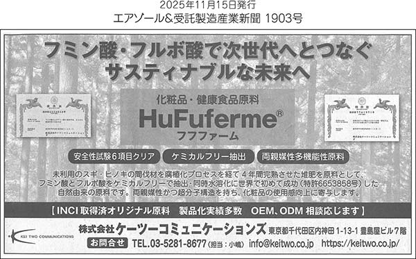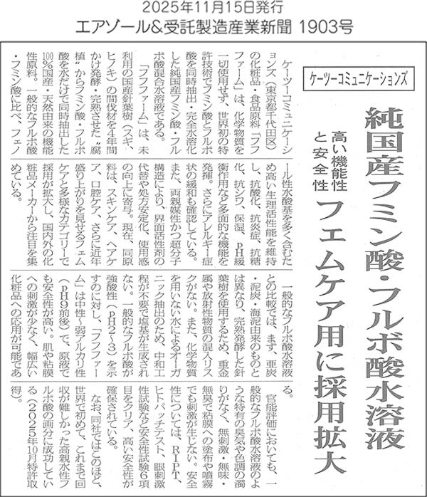 化学物質を一切使用せず、世界発の特許技術でフミン酸・フルボ酸を同時抽出・完全水溶化した純国産の化粧品・食品原料『HuFufermeⓇ(フフファーム)』が、高い機能性と安全性でフェムケア用に採用が拡大しているとして、2025年11月15日発売の業界紙「エアゾール&受託製造産業新聞」1903号の「注目のへアケア・スキンケア原料 -機能性・環境対応・感性価値が導く新潮流-」特集に掲載されました。