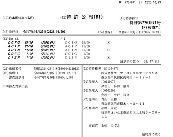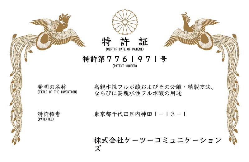 この度、弘前大学名誉教授である青山正和博士(農学)と弊社代表の小嶋がかねてより研究・開発してまいりました「高親水性フルボ酸およびその分離・精製方法、ならびに高親水性フルボ酸の用途」について、下記のとおり特許を取得しましたのでお知らせいたします。